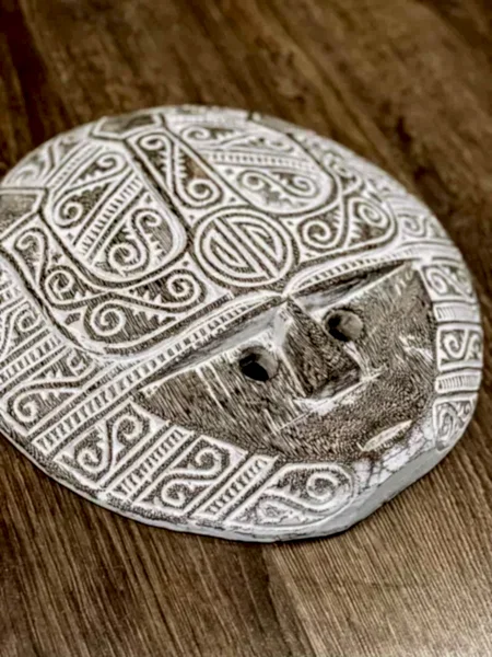 The SUMATRA S mask is hand carved by Balinese artisans from lightweight balsa wood and finished with a whitewashed patina that highlights the fine spiral and geometric carving. The warm brown tone with soft whitening adds a timeworn, ethnic character. Its compact 30 cm diameter makes it a perfect accent for a shelf, console or a wall gallery with baskets and woven art.