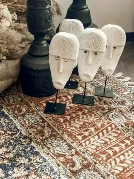 The BRISA mask is crafted by Balinese artisans from lightweight balsa wood - every carving stroke reads like wind on sand. A matte white patina highlights the geometric motif on the forehead and the gentle facial expression. This compact art object sets a warm accent on a console, shelf or mantel and blends easily into boho, japandi, wabi-sabi and coastal interiors.